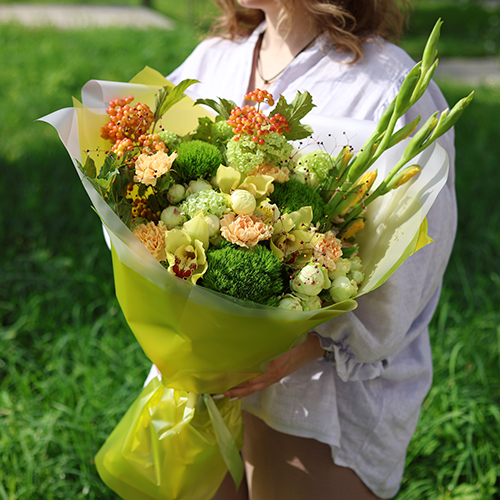 Букет "Жаркое лето" из калины, гладиолусов, кустовых пионовидных роз, диантусов и орхидей