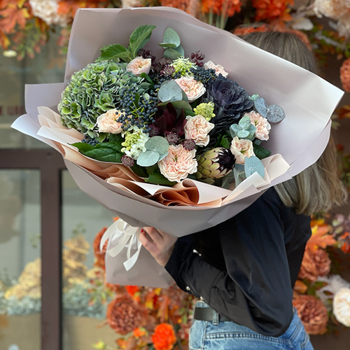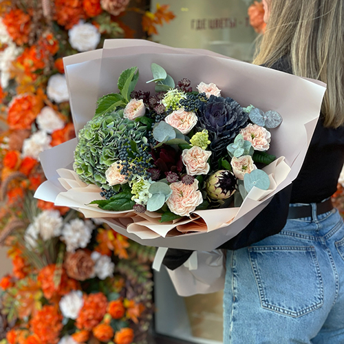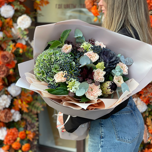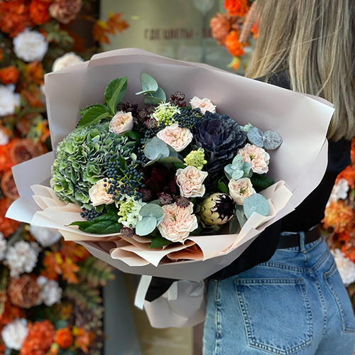 Букет "Ночь нежна" из Голландской гортензии, ягод вибирнума, сафари, махровых роз, протеи, брассики и орнитогалума