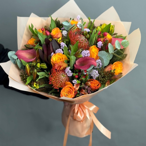 Букет "Даниэлла" из калл, роз, гиперикума, сафари, капса и лейко