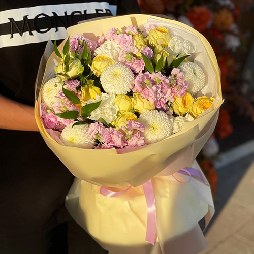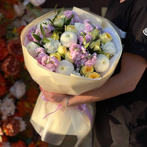 Букет "Секрет" из ароматных маттиол, диантусов, кустовых пионовидных роз и хризантем Момоко