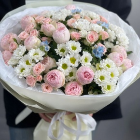 Букет "Маргоша" из хризантем сантини ,кустовых пионовидных роз Мэнсфилд парк и оксипеталума