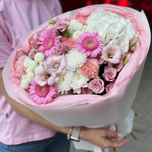 Букет "Розовые облака" из хризантемы, кустовых роз, диантусов, гортензии и эустом