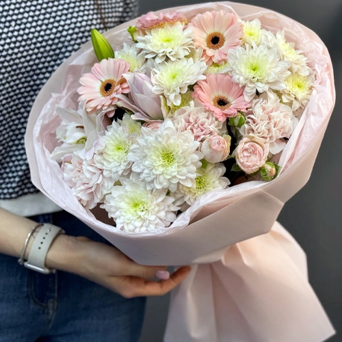 Букет "Дружба" из хризантемы, пионовидной лилии, гербер, диантусов и кустовых роз