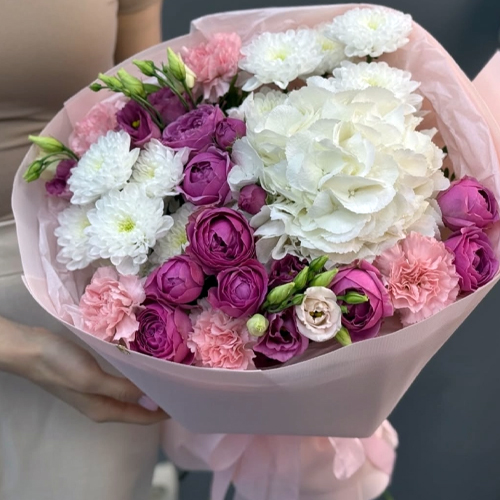 Букет "Вуаль" из хризантемы, кустовых пионовидных роз Мисти Баблз, диантусов, Голландской гортензии и эустом