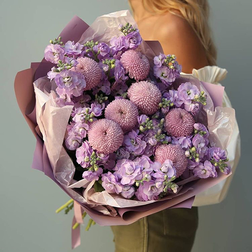 Букет "Голос вселенной" из кустовых маттиол и хризантем Момоко
