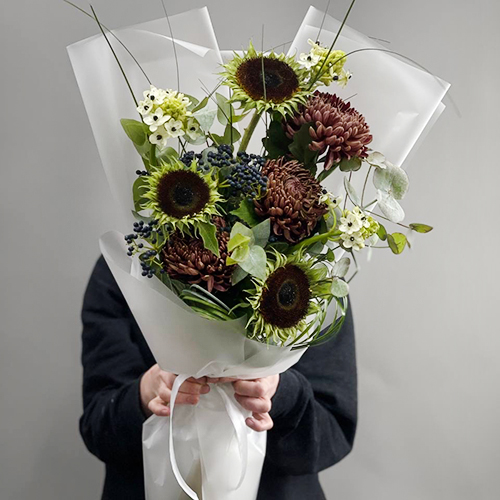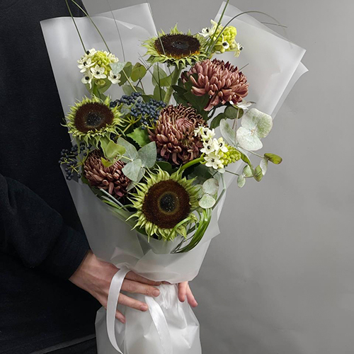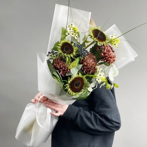 Букет "Джазз" из подсолнуха экзотик, орнитагалума, ягод вибирнума и хризантем Бигоуди
