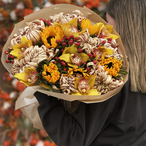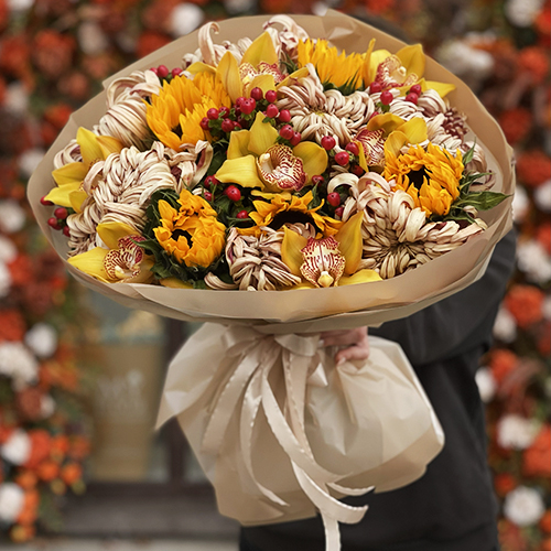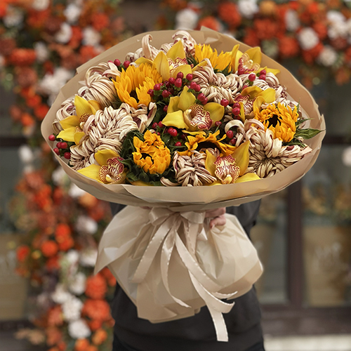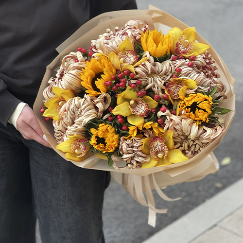 Букет "Биркин" из подсолнухов, орхидей, гиперикума, хризантем Виена