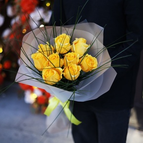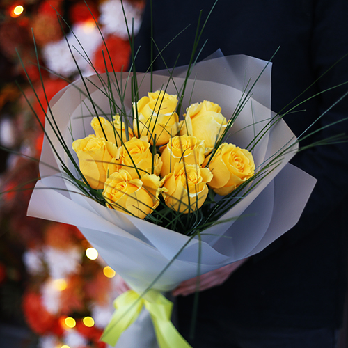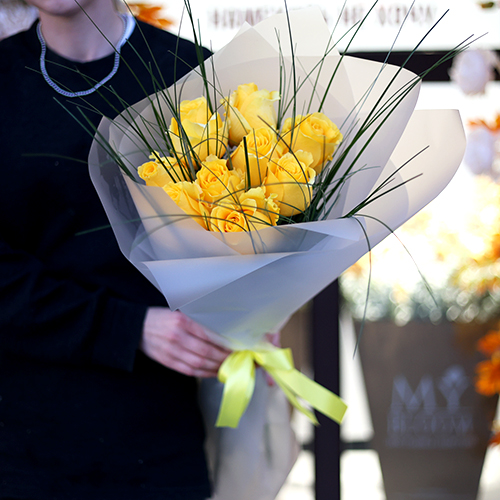 Букет "Еллоу" из 9 ярких роз с берграссом (70 см)