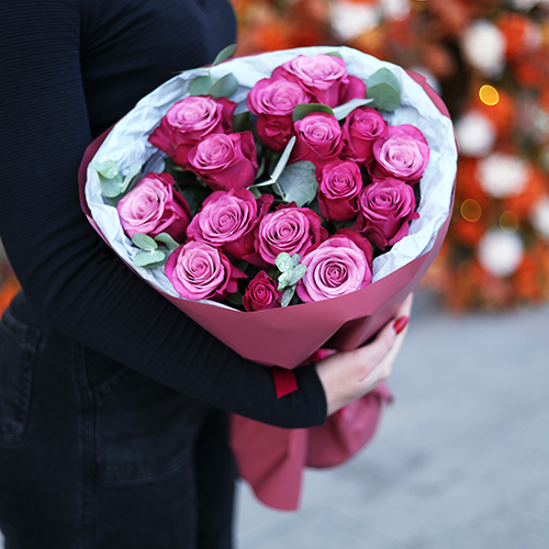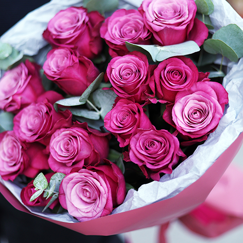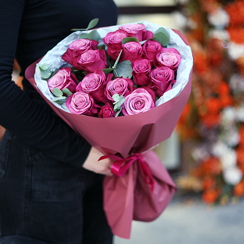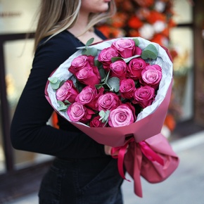 Букет из 15 роз Космик с эвкалиптом (50 см)