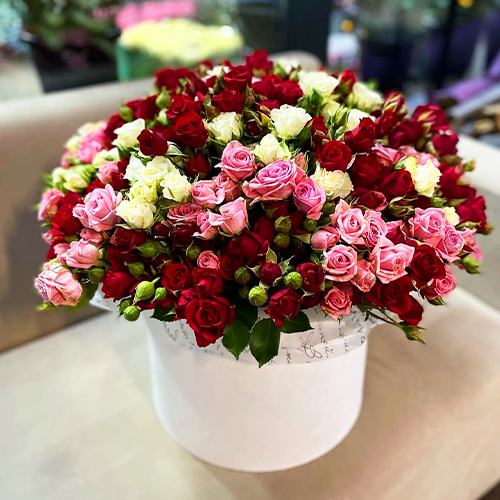 Композиция в шляпной коробке из 101 кустовой розы микс (50 см)