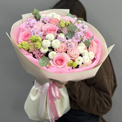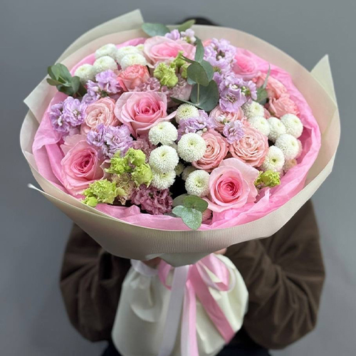 Букет "Влюбленный" из хризантем Ньютон, ароматных маттиол, эустом и пионовидных роз