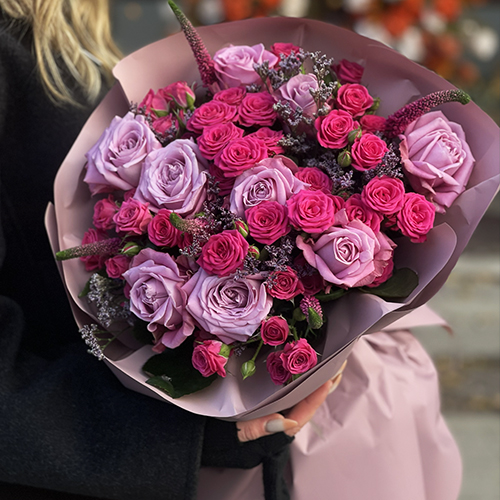 Букет "Малиновый вечер" из кустовых малиновых роз, вероники, лимониума и роз Меритим