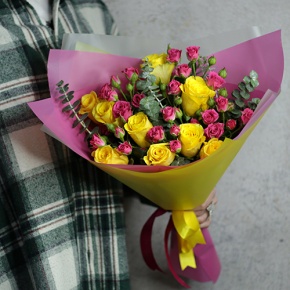 Букет "Малибу" из ярких роз с веточками эвкалипта
