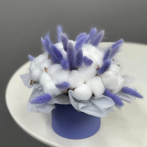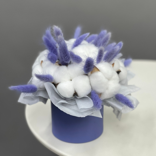 Композиция в шляпной коробке мини из хлопка и лагуруса
